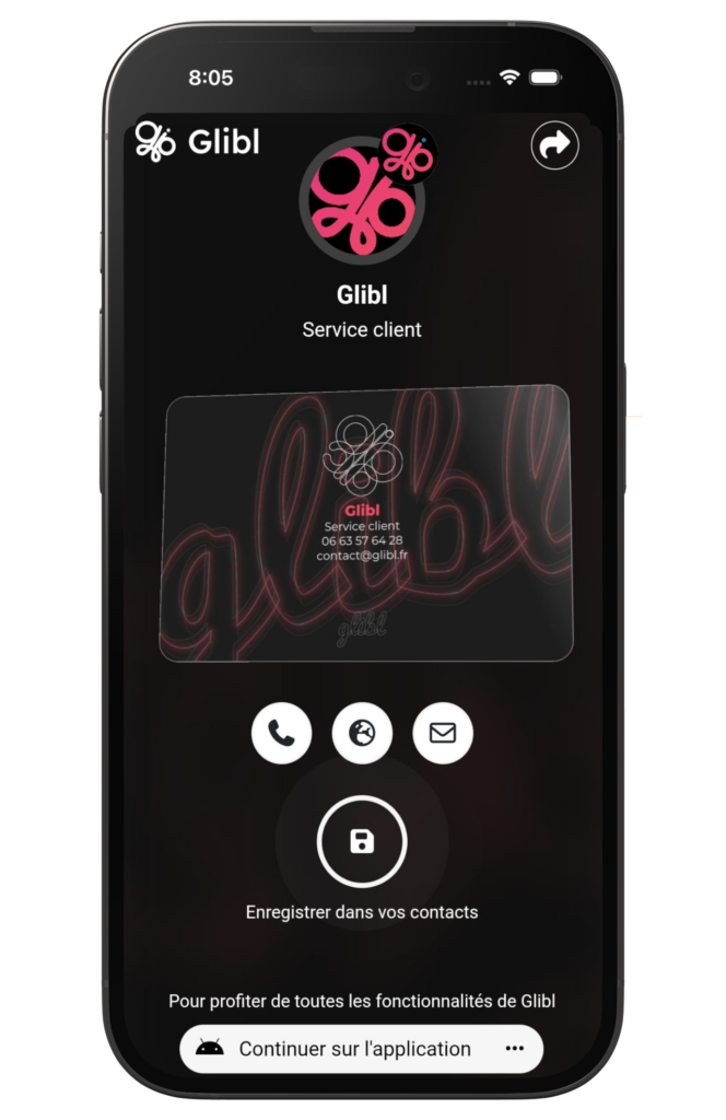 Avec Glibl, partagez votre carte de visite numérique en toute simplicité, et laissez une impression durable.